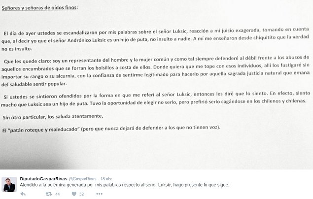 La misiva, difundida por El Mostrador, está fechada el 19 de abril, mismo día en el cual Rivas, en medio de la discusión de la agenda corta antidelincuencia impulsada por el Gobierno, se refirió a Luksic como "el máximo delincuente" e "hijo de puta".