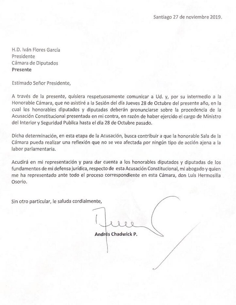 Chadwick no asistirá a sesión que analizará acusación constitucional en su contra
