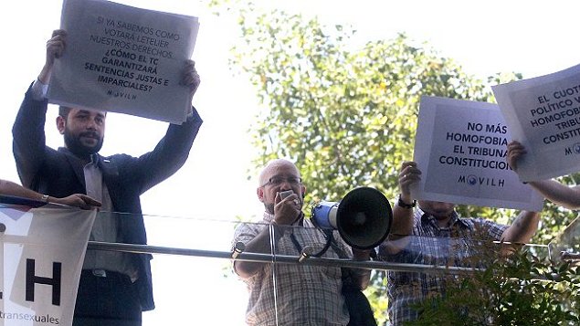 "El cuoteo político permite que llegue a esta institución un personaje homofóbico, quien ha calificado a los homosexuales de desviados y contrarios al amor", dijeron los activistas del Movilh que ayer protestaron con pancartas y un megáfono en la sede del TC.