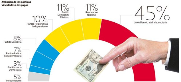Según estas cifras, el 45 por ciento de los pagos presuntamente irregulares -no respaldados- está ligado a la UDI, el 11 por ciento a RN, igual porcentaje a la DC, 10 por ciento al PRI, 8 por ciento al PS, 7 por ciento al PRSD y 3 por ciento al PPD.
