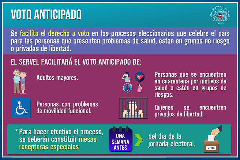 El texto define que, "para facilitar el voto de adultos mayores, de quienes tengan problemas de movilidad funcional, de personas que se encuentren en cuarentena por motivos de salud o que estén en grupos de riesgos, así como de quienes se encuentren privadas de libertad, el Servicio Electoral (Servel) podrá facilitar el voto anticipado".