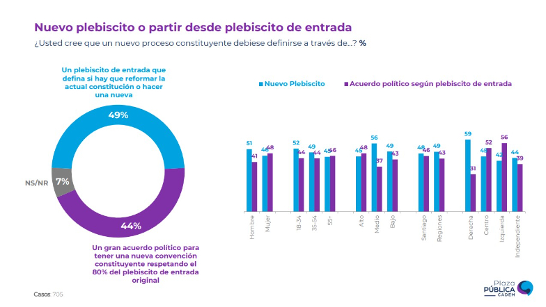 La encuesta Plaza Pública Cadem reveló que un 76% de los sondeados quiere que se inicie un nuevo proceso constituyente, mientras que un 49% quiere que para que comience esta etapa haya un plebiscito de entrada que defina si se reforma la actual Carta Magna o redactar una nueva.