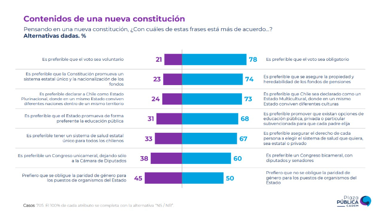 En relación al debate sobre el fondo constitucional, 78% prefiere voto obligatorio, 74% está por asegurar propiedad y heredabilidad de fondos de pensiones, 73% prefiere la multiculturalidad por sobre la plurinacionalidad, 68% la promoción y libertad de elección de todo tipo de educación, 67% libertad de elección en salud por sobre un sistema único, 60% un congreso bicameral y 50% que no se obligue paridad de género para los puestos del sector público.