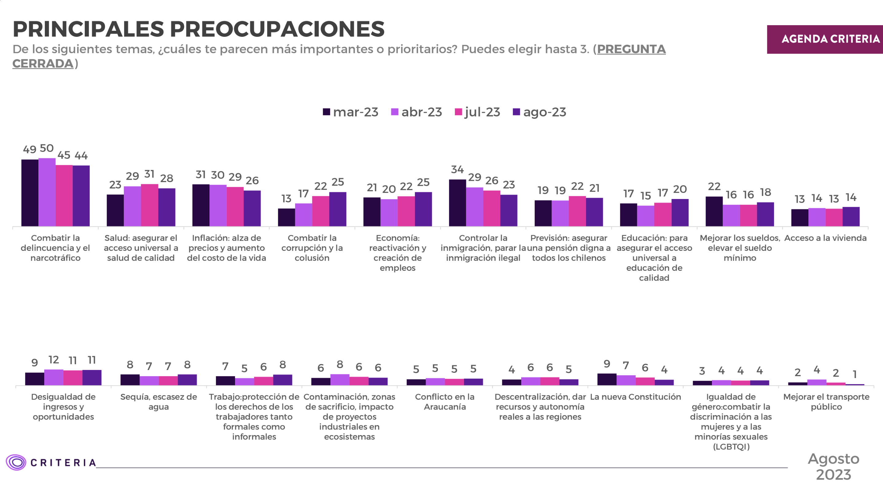 A la vez, la delincuencia y el narcotráfico se mantienen en el primer lugar, seguidas de asegurar el acceso universal a salud de calidad, y la inflación y reactivación económica siguen siendo altamente relevantes.