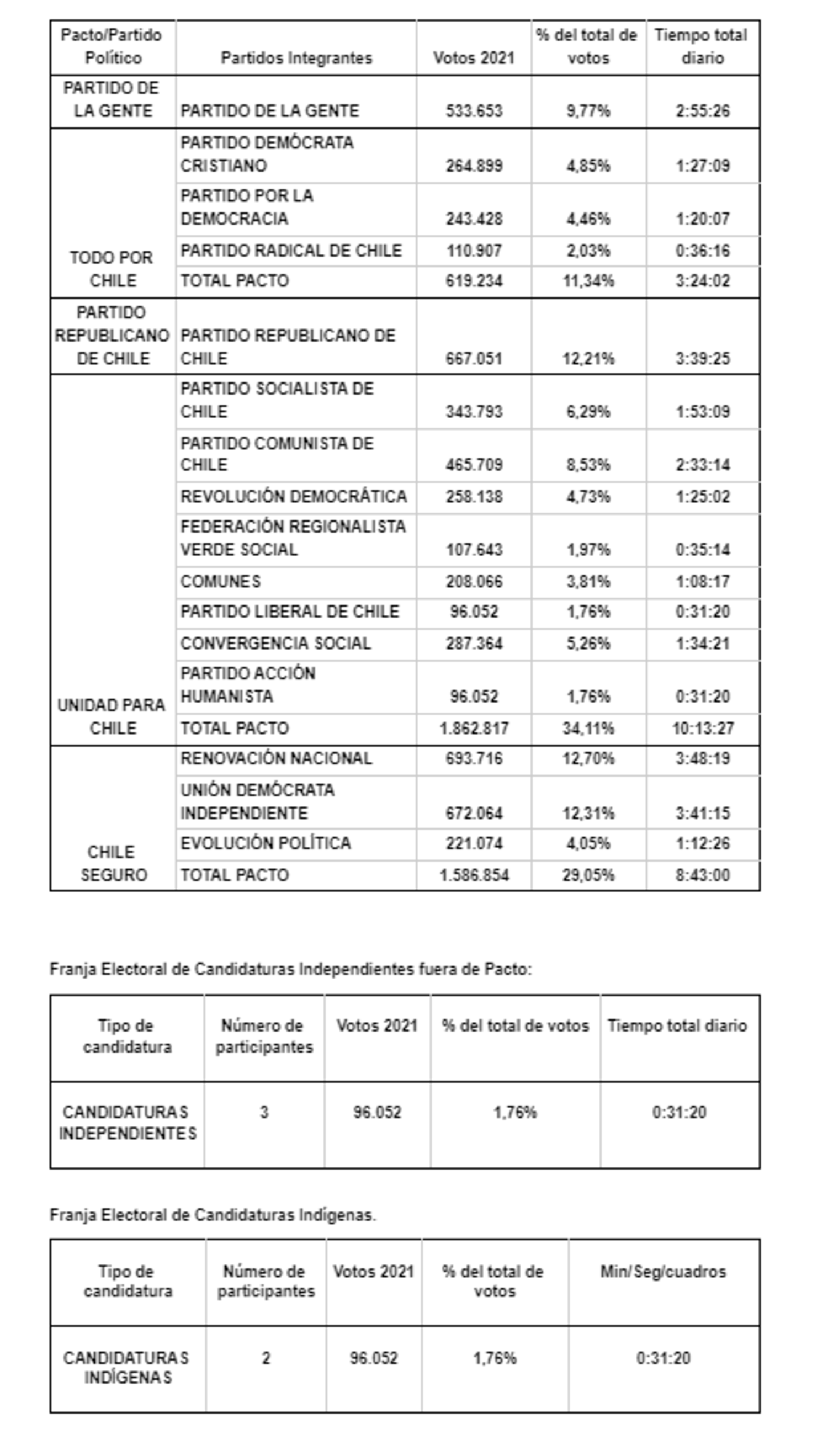 La distribución de los tiempos se realizará según el cuadro presentado a continuación, el que establece el tiempo total diario de cada participante. Dicho tiempo diario, deberá ser dividido en partes iguales para las dos emisiones diarias en televisión.