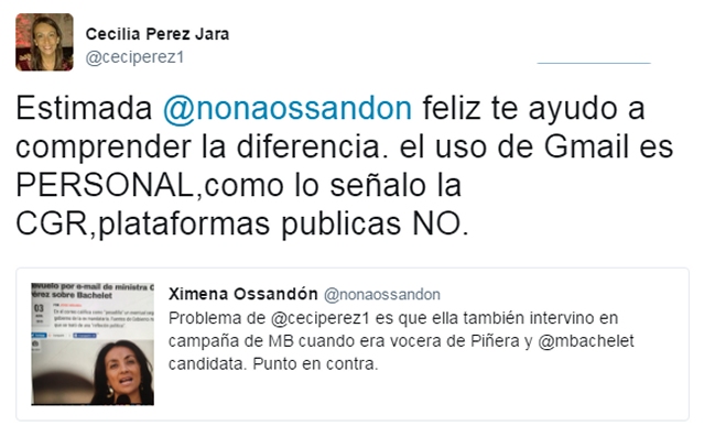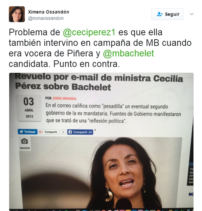 La hermana del presidenciable Manuel José Ossandón dijo que la ex ministra intervino contra la campaña de Michelle Bachelet.