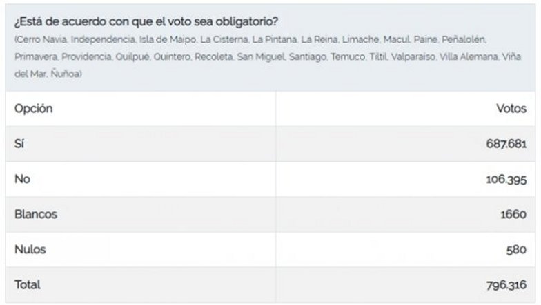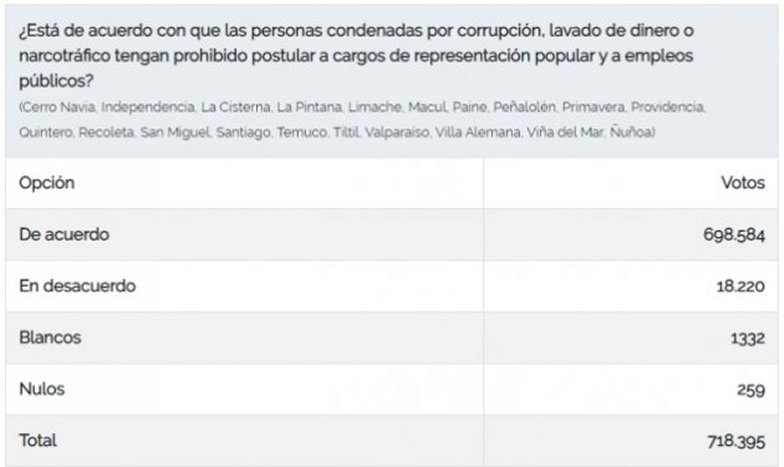 Finalmente, también se entregaron datos acerca de las preguntas sobre retomar el voto obligatorio en nuestro país y si las personas condenadas por lavado de dinero, corrupción o narcotráfico pueden postular a cambios públicos.