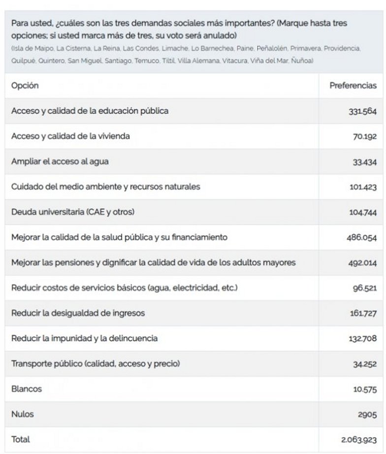 De acuerdo a las papeletas de votación, se consultaba acerca de las demandas sociales, donde se podían elegir tres opciones y las tres más votadas fueron mejora de las pensiones, seguido por el fortalecimiento a la salud pública y la calidad de la educación pública.