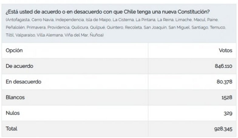 Más temprano, cerca de las 19:00 horas, se anunció que las 29 comunas que realizaron la Consulta Ciudadana de forma electrónica (a través de la empresa EVoting) contaban con una participación de 1.055.044 personas, de las cuales 849.110 eligieron la nueva Constitución como opción, mientras que 80.378 lo hicieron en contra.