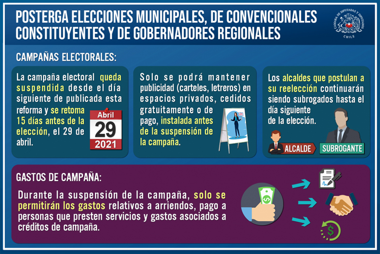 A su vez, se modifica la fecha de mandato de alcaldes y concejales -que ya había sido prorrogado hasta el 24 de mayo-, hasta el 28 de junio. Los alcaldes que se postulen a la reelección se mantendrán suspendidos hasta el día siguiente de verificada la elección (17 de mayo), tal y como lo determinaron ayer las comisiones unidas de Gobierno Interior y Constitución de la Cámara de Diputadas y Diputados.