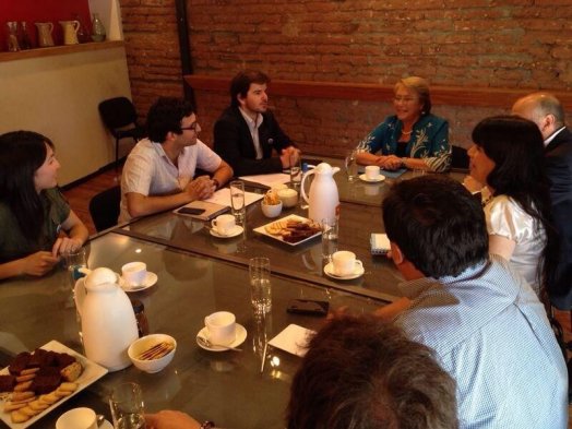 La candidata presidencial de Nueva Mayoría, Michelle Bachelet, recibió este miércoles en su comando a la directiva de Revolución Democrática encabezada por su diputado electo, Giorgio Jackson.