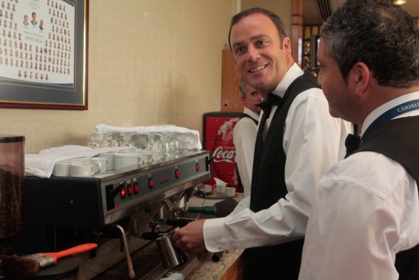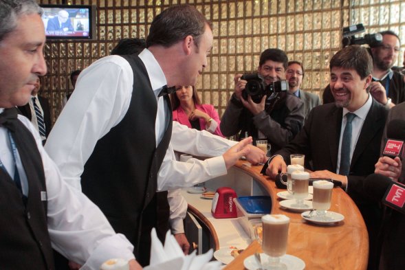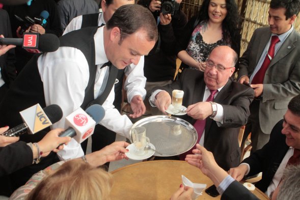 El diputado UDI Felipe Ward se unió a los garzones de la cafetería del Congreso y le sirvió a sus pares para cumplir así con la apuesta que les hizo, en la que él esperaba una victoria de Evelyn Matthei.