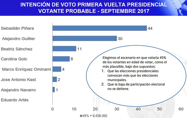 Los autores del estudio indicaron que en "un escenario donde vota el 45 por ciento" del total -número que se considera "el más plausible"-, el candidato de Chile Vamos concita el 44 por ciento del apoyo, seguido por Alejandro Guillier (30%), Beatriz Sánchez (11%) y Carolina Goic (8%).