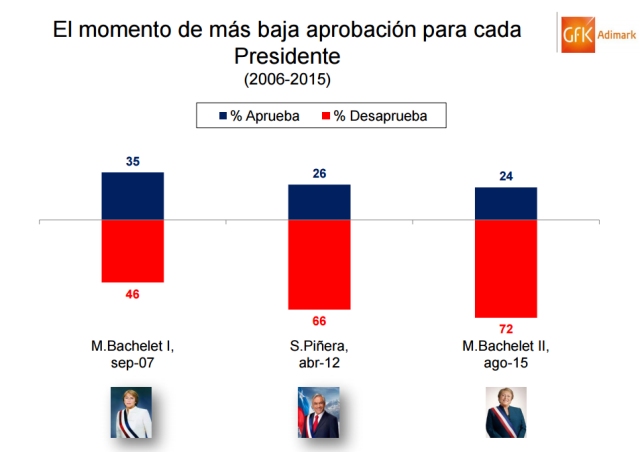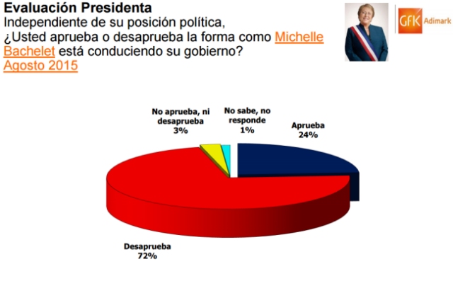 La aprobación de la Presidenta Michelle Bachelet sufrió un nuevo descenso en su popularidad, alcanzando un inédito 24 por ciento de aprobación, según la encuesta Adimark de agosto, logrando la cifra más baja desde 2006.