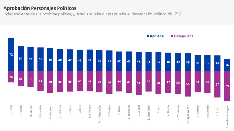 Tras ellos, se ubica la ex candidata presidencial del Frente Amplio, Beatriz Sánchez, cuya aprobación bajó del 50 por ciento al 46 por ciento en la encuesta.