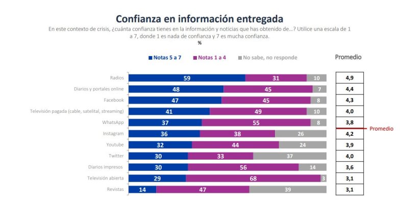 Una perspectiva similar arrojó en diciembre el estudio de opinión pública de Uso y evaluación de los medios de comunicación y las redes sociales durante el estallido social, realizado por Comunicaciones UC, que arrojó una nota 4,7 (la mejor de la encuesta) a las radios.