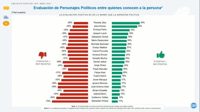 Sin que signifique adhesión, el personaje político mejor evaluado fue la diputada humanista Pamela Jiles, quien obtuvo un 54 por ciento, seguida por los candidatos de Chile Vamos Joaquín Lavín (32%), Sebastián Sichel (30%), Mario Desbordes (29%) y Evelyn Matthei (27%).