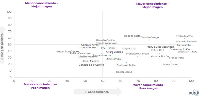 Los peor evaluados son, en tanto, el alcalde de Recoleta, Daniel Jadue (Partido Comunista, 24 por ciento), el exmilitante republicano Gonzalo de la Carrera y el timonel PC, Guillermo Tellier, ambos con sólo 23 por ciento de menciones positivas.