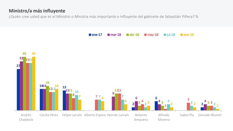 Los autores del sondeo indicaron que, en éste, "la noticia más importante viene de la mano del ministro del Interior Andrés Chadwick", quien, si bien "sigue siendo el ministro más conocido del gabinete (86%) y el más importante (35%, +4pts)"; considerado como "el más influyente", sufre "un retroceso estadísticamente significativo en su nivel de aprobación, pasando de 43% a 37%.