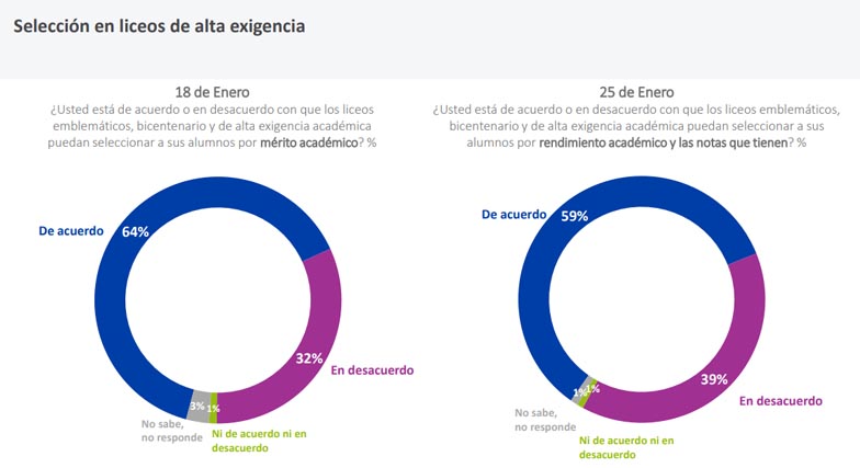 Además, en relación con el cuestionado proyecto Admisión Justa, el 59 por ciento se mostró de acuerdo con que los colegios de alta exigencia puedan seleccionar a sus alumnos por rendimiento académico y notas, llegando a un 67 por ciento entre padres con hijos en edad escolar; y sin mostrar diferencias estadísticamente significativas con respecto a la evaluación de la semana anterior cuando se utilizó el concepto "mérito".