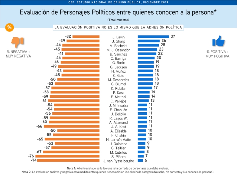 Además, Piñera (76 por ciento), Van Rysselberghe (74 por ciento) y Cubillos (67 por ciento) son los personajes con mayor evaluación negativa, seguidos por José Antonio Kast (66 por ciento).