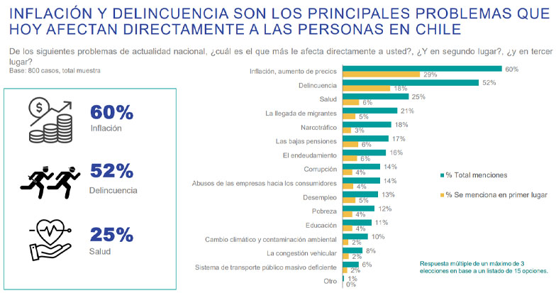 La inflación y la delincuencia se instalan como los problemas que más están afectando a los chilenos, según constató el último informe "Claves Ipsos" elaborado por la consultora del mismo nombre.