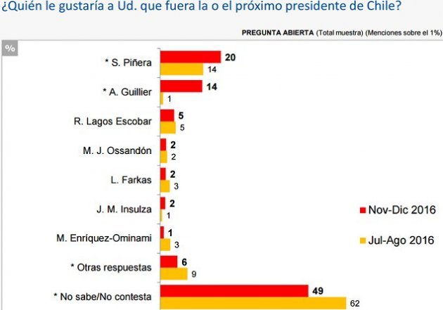 El estudio del Centro de Estudios Públicos consignó luego que, ante la pregunta sobre a quién preferirían tener como próximo Presidente de Chile, el 20 por ciento de los encuestados se inclinó por Sebastián Piñera y el 14 por ciento lo hizo por Alejandro Guillier.