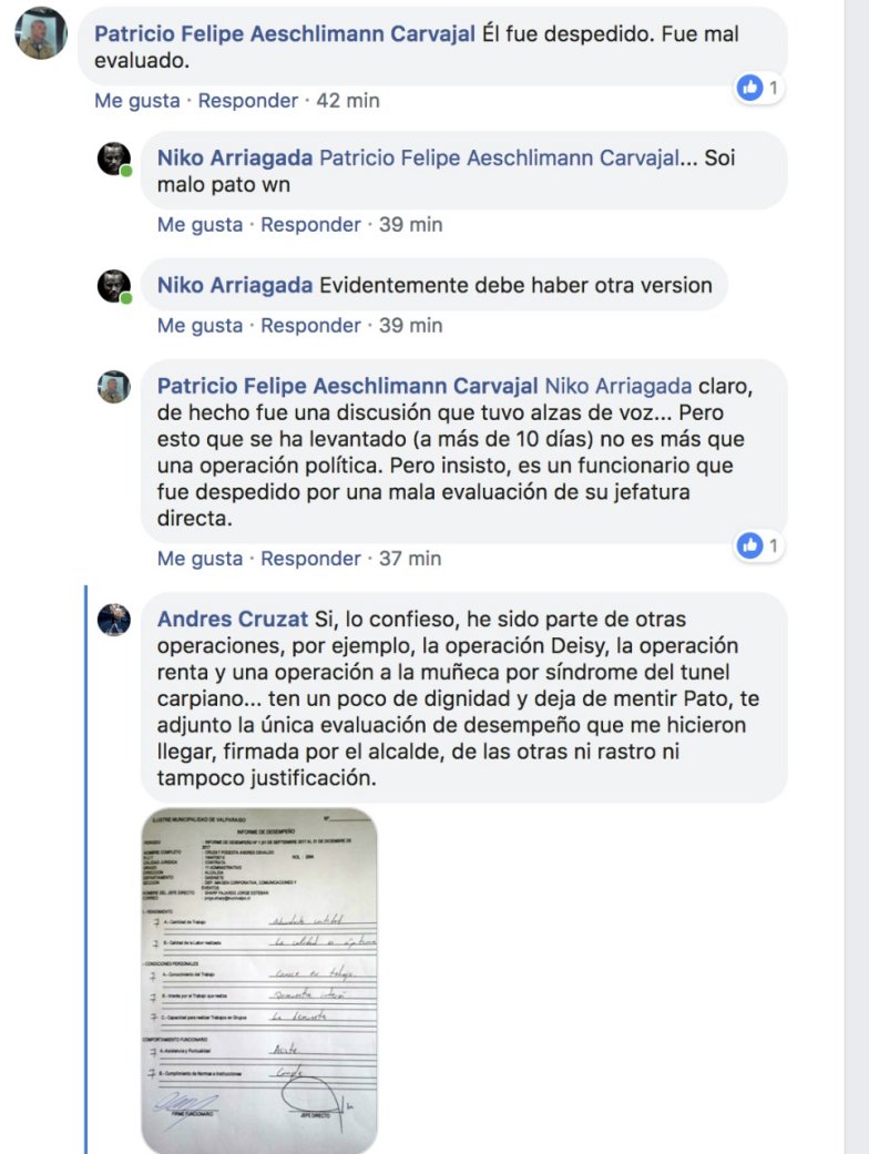 Sin embargo a través de Facebook el propio Aeschliman aseguró que la denuncia Andrés Cruzat se trataba "de una operación política" e insistió que fue un despido relacionado a su "desempeño laboral" y a una "mala evaluación" de su jefatura directa.