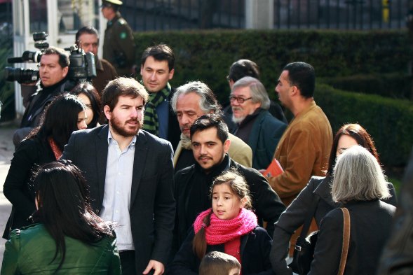 Parlamentarios de la Nueva Mayoría, dirigentes junto a militantes, celebran el aniversario por los 102 años del Partido Comunista, en el salón de Honor del Congreso Nacional en Santiago.
