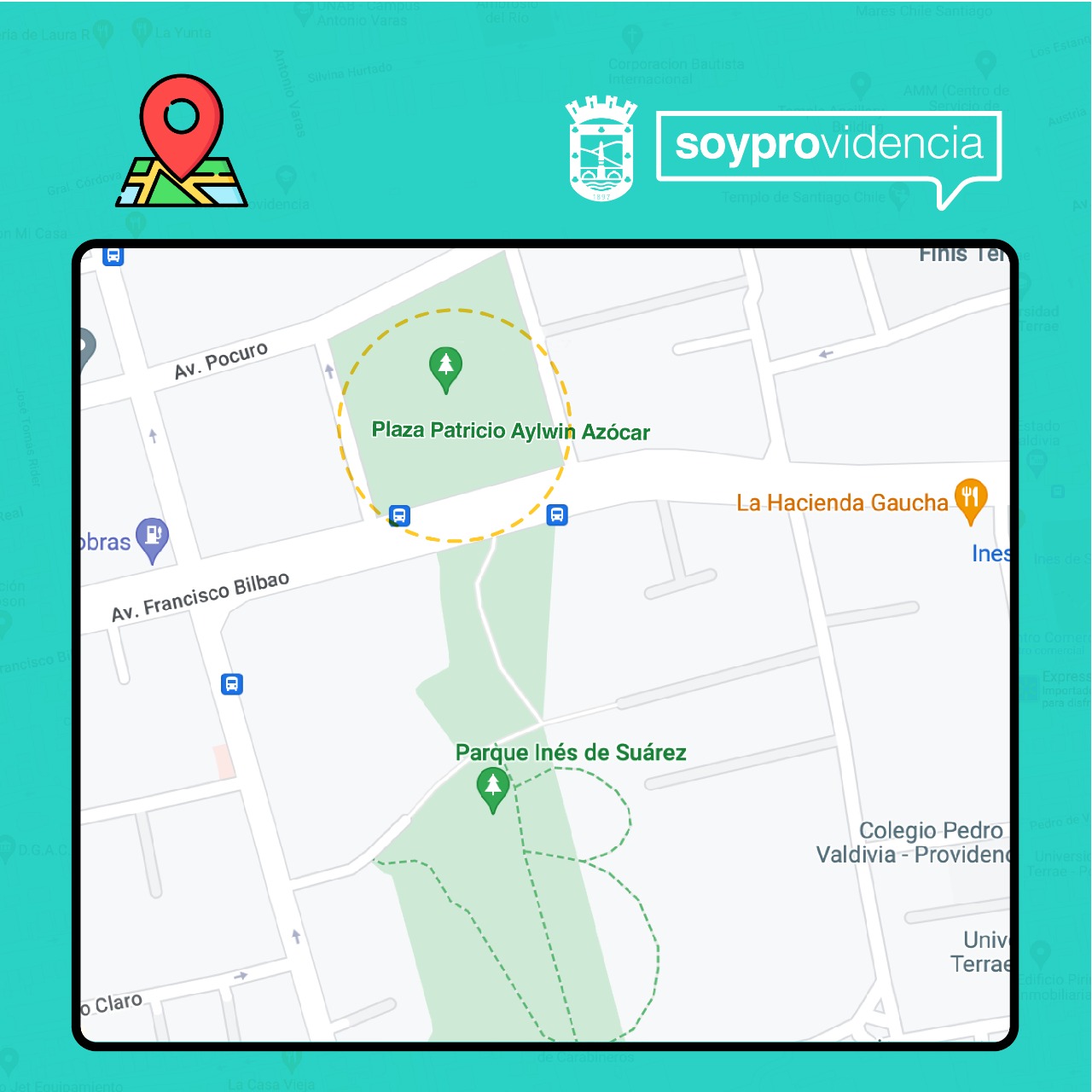 La plaza, que tiene tiene 15.000 metros cuadrados de áreas verdes y que está siendo remodelada por completo, está ubicada entre las calles Pocuro, Francisco Bilbao, Escuela de Comunicaciones y Regimiento Cazadores, justo al frente del Parque Inés de Suárez, el que mantiene su nombre original.