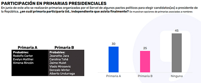 De hecho, el sondeo arrojó también que un 45% indica que no participará en ninguna primaria, mientras que un 30% lo haría en la de Chile Vamos, donde figuran Matthei y Rincón, y un 25% en la oficialista, que incluye a Tohá, Jara y Winter, entre otros.