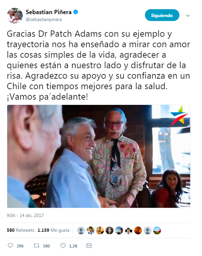 Sorpresa causó el video que publicó el candidato de Chile Vamos, Sebastián Piñera, donde el reconocido médico Patch Adams le entregaba su apoyo de cara a las elecciones de este domingo.