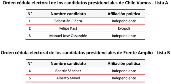 En cuanto al orden, Sebastián Piñera será A1, Felipe Kast A2, Manuel José Ossandón A3, Beatriz Sánchez B4 y Alberto Mayol B5.