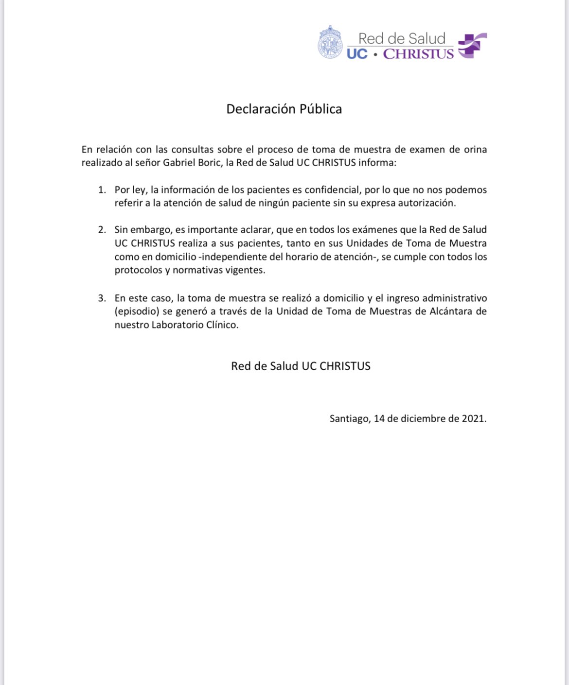 A raíz de dudas en redes sociales por el día y hora en que Gabriel Boric (Apruebo Dignidad) se hizo su test de drogas, la Red de Salud UC Christus aclaró que su personal le tomó la muestra en su domicilio.