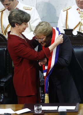 La presidenta del Senado, Isabel Allende, coloca la banda presidencial a la Presidenta Michelle Bachelet en el salón honor del Congreso Nacional durante la ceremonia del cambio de mando presidencial 2014.