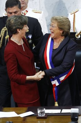 La presidenta del Senado, Isabel Allende, coloca la banda presidencial a la Presidenta Michelle Bachelet en el salón honor del Congreso Nacional durante la ceremonia del cambio de mando presidencial 2014.
