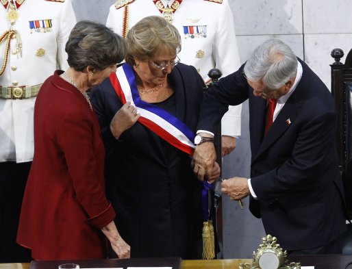 La presidenta del Senado, Isabel Allende, coloca la banda presidencial a la Presidenta Michelle Bachelet en el salón honor del Congreso Nacional durante la ceremonia del cambio de mando presidencial 2014.