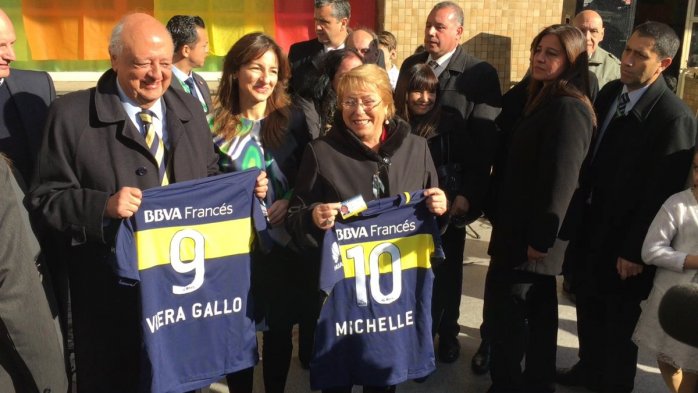 En el marco de su visita oficial a Argentina, la Presidenta Michelle Bachelet recibió este jueves un carné que la acredita como socia honoraria del club de fútbol Boca Juniors. La Mandataria recibió una camiseta con su nombre y el número 10 de Diego Armando Maradona y Juan Román Riquelme. El embajador José Antonio Viera-Gallo obtuvo la 9.