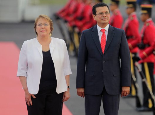 Al aterrizar en El Salvador, donde realiza una breve visita oficial, la Presidenta Michelle Bachelet fue recibida en el aeropuerto Internacional Monseñor Óscar Arnulfo Romero por el canciller Hugo Martínez, la embajadora María Inés Ruz y el alcalde Nayib Bukele, quien le entregó las llaves de la capital y la declaró