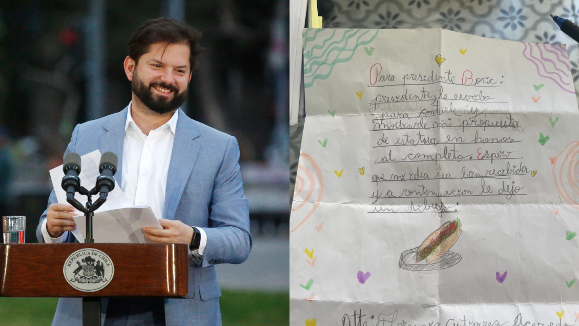 "Para el Presidente Boric: Presidente, le escribo para contarle y mostrarle mi propuesta de estatua en honor al completo. Espero que mi idea sea bien recibida. P.D: La palta va arriba del tomate", escribió la pequeña en la carta, donde incorporó un dibujo para ilustrar su idea.