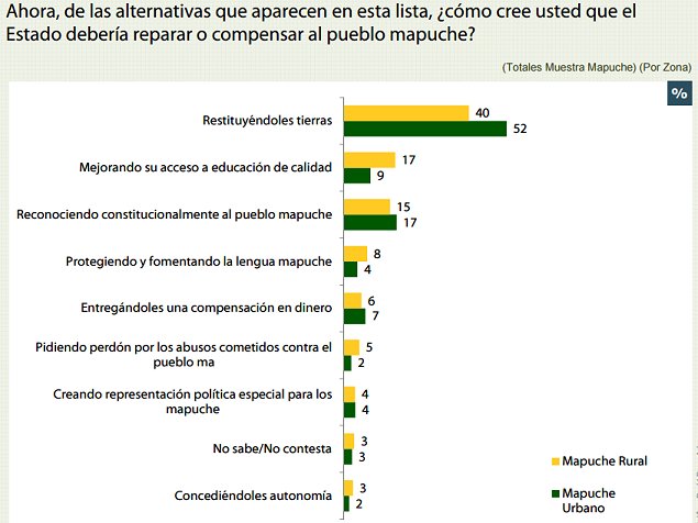 La encuesta reveló que ésta sigue siendo la principal demanda de los mapuche al Estado de Chile, tanto entre quienes residen en las ciudades como en zonas rurales, con 52 y 40 por ciento de preferencias, respectivamente.