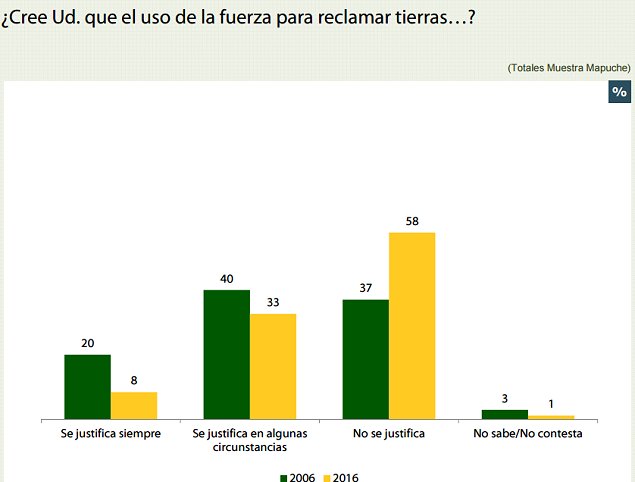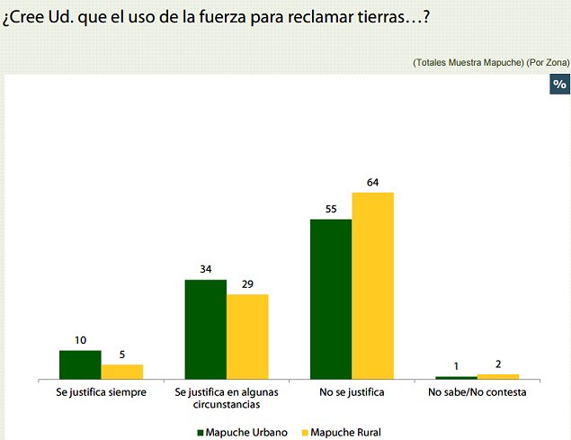 Consultados por el uso de la fuerza para el reclamo de tierras, el 55 por ciento de los mapuche urbanos y el 64 por ciento de los mapuche rurales señalaron que ésta "no se justifica", mientras un 10 y un 5 por ciento, respectivamente, señaló que "se justifica siempre".