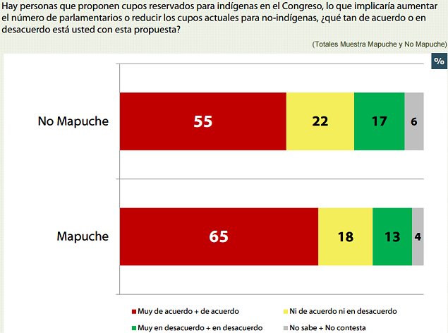 "Hay un rechazo a los mecanismos institucionales vigentes hoy día; en general, a las personas representantes de esto, que, aparentemente, no han podido canalizar esta demanda. Por eso hay, por ejemplo, tanto respaldo a los cupos reservados (en el Parlamento): más del 60 por ciento de los mapuche respaldaba el uso de escaños reservados. A lo mejor ése podría ser, para ellos, un mecanismo por el cual se podrían canalizar institucionalmente estas demandas", comentó Ricardo González.