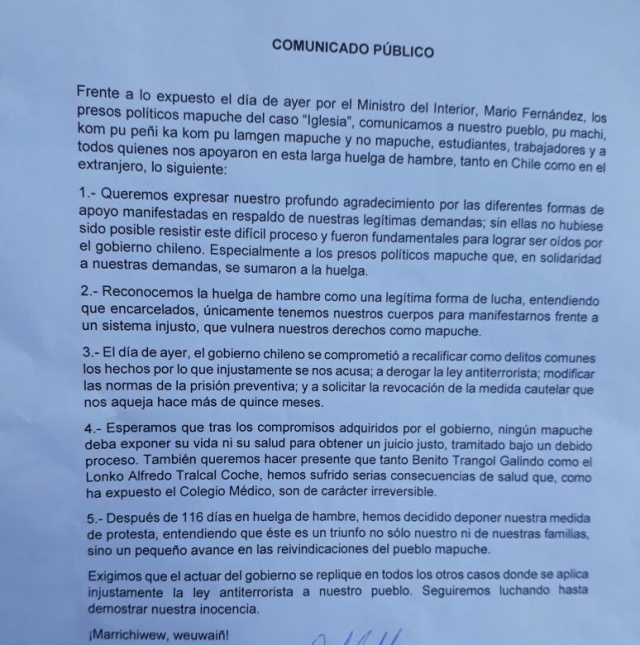 "Queremos expresar nuestro profundo agradecimiento por las diferentes formas de apoyo manifestadas en respaldo de nuestras legítimas demandas, sin ellas no hubiese sido posible resistir este difícil proceso y fueron fundamentales para lograr ser oídos por el gobierno chileno. Especialmente a los presos políticos mapuche que, en solidaridad a nuestras demandas, se sumaron a la huelga", señala la misiva firmada por Pablo y Benito Trangol, además de Alfredo Tralcal.