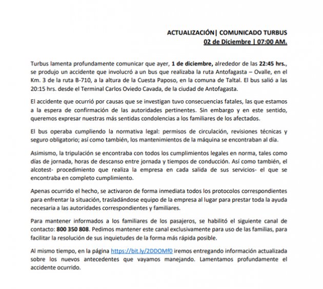 | #Turbus aseguró que bus accidentado en #Taltal "operaba cumpliendo la normativa legal: permisos de circulación, revisiones técnicas y seguro obligatorio; así como también, los mantenimientos de la máquina se encontraban al día"