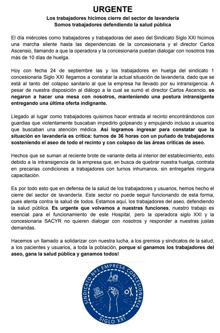 Los trabajadores del aseo en huelga se tomaron este viernes la lavandería del Hospital Regional de Antofagasta, a modo de protesta contra la Sociedad Concesionaria Siglo XXI, que los contrata, a la que le exigen subsanar distintos asuntos para no poner en riesgo la salud de todos en el recinto.