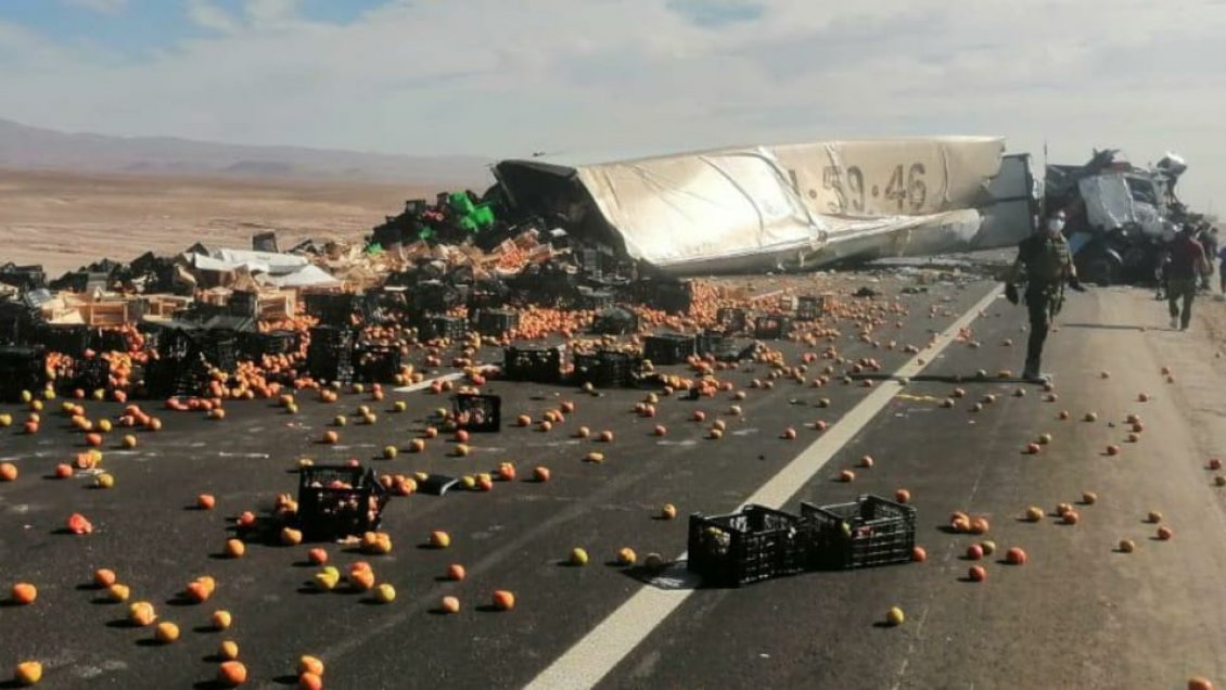 El hecho se produjo pasadas las 10:00 horas, cuando ambos vehículos -un camión pluma que se dirigía al norte y un camión artículado cargado con tomates, que iba en sentido contrario- impactaron de frente, quedando ambos vehículos y la carga bloqueando el camino.