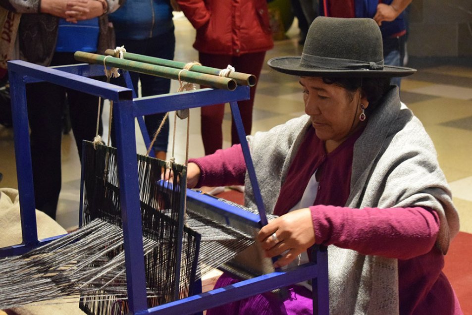 Artesana tejedora explicó al publico como se usa su telar.