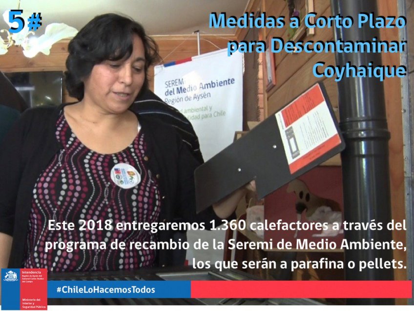 La Intendencia de la Región de Aysén presentó una serie de medidas "concretas y de corto plazo" para enfrentar el problema de la contaminación en la ciudad de Coyhaique. Las propuestas son paralelas al Plan de Descontaminación Ambiental (que aún está en revisión en Contraloría) y fueron abordadas y trabajados por una mesa intersectorial, "donde la comunidad también participó de forma activa", según el Gobierno Regional.