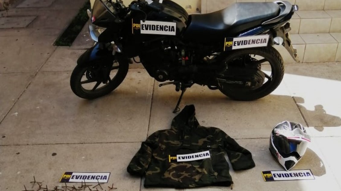El motociclista fue ubicado luego de que la PDI realizara un barrido por diferentes cámaras de seguridad del sector y fue detenido por los funcionarios policiales. Se incautó la motocicleta en la que se movilizaba, las vestimentas utilizadas y una gran cantidad de 'miguelitos'.